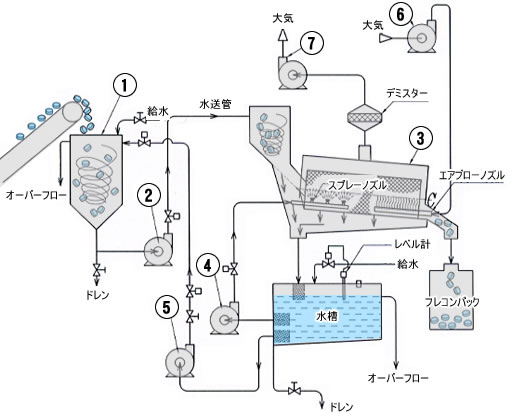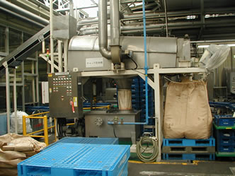 樹脂キャップ洗浄設備 本設備は飲料ボトル類の樹脂キャップに付着した付着物を水送管及び洗浄機を通して除去する一連のリサイクル設備です。